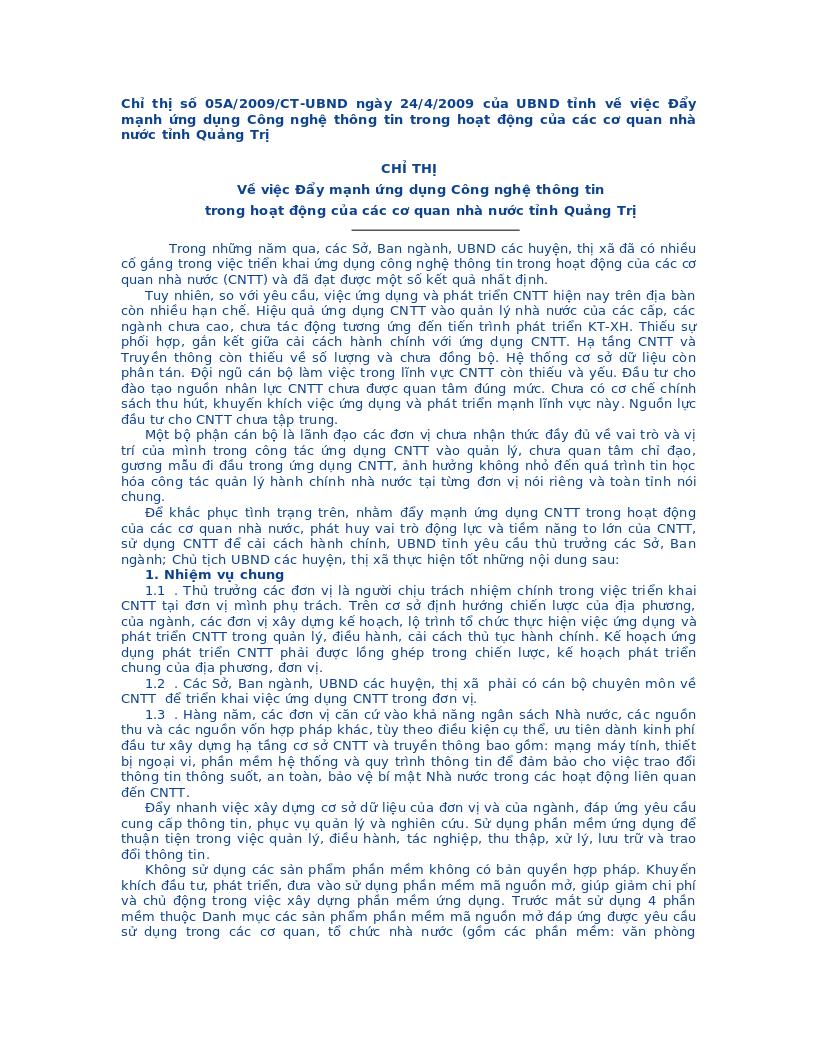 | Tiêu đề văn bản | Chỉ thị về việc đẩy mạnh ứng dụng công nghệ thông tin trong hoạt động của các cơ quan nhà nước tỉnh Quảng trị | ||