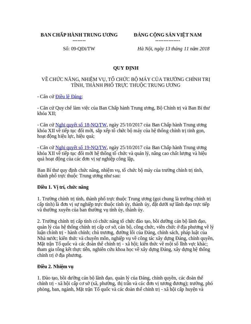 | Tiêu đề văn bản | Quy đinh 09-QĐi/TW về chức năng, nhiệm vụ, tổ chức bộ máy của trường chính trị tỉnh, thành phố trực thuộc Trung ương | ||