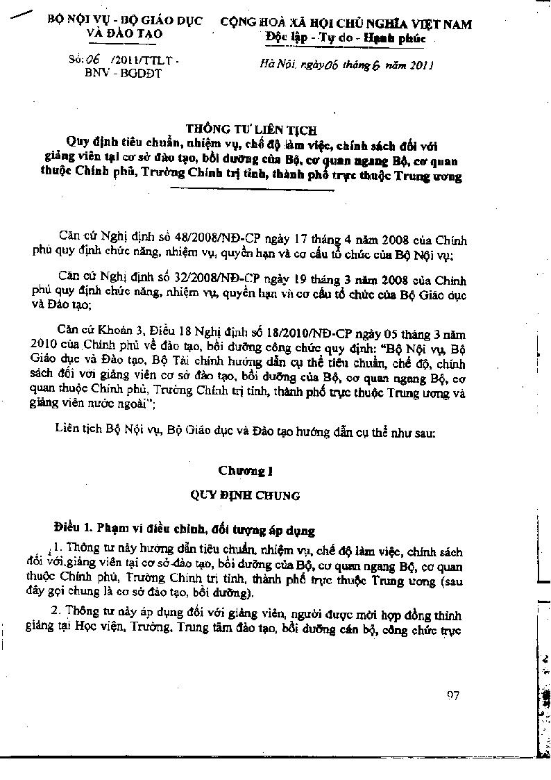 | Tiêu đề văn bản | Thông tư liên tịch quy định tiêu chuẩn, nhiệm vụ, chế độ làm việc, chính sách với giảng viên tại cơ sở đào tạo, bồi dưỡng của Bộ, cơ quan ngàn Bộ, cơ quan thuộc Chính phủ, Trường Chính trị Tỉnh, thành phố trực thuộc Trung ương | ||