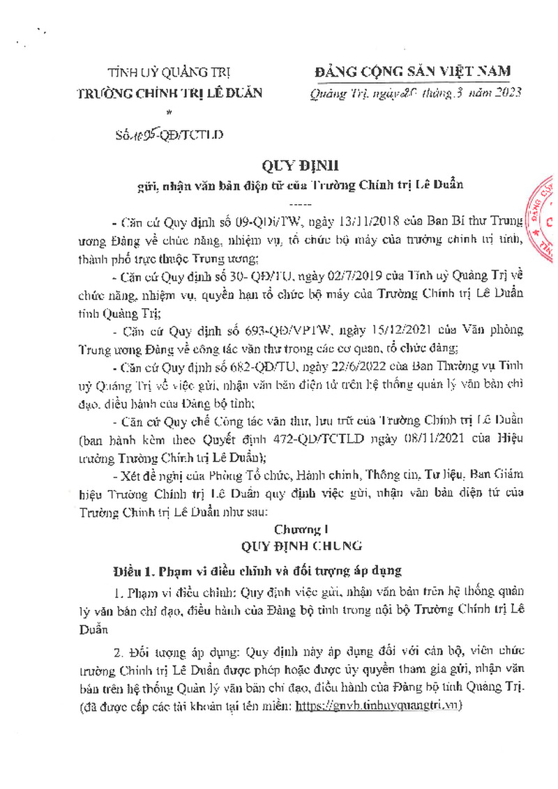 | Tiêu đề văn bản | Quy định gửi, nhận văn bản điện tử của Trường Chính Trị Lê Duẩn | ||