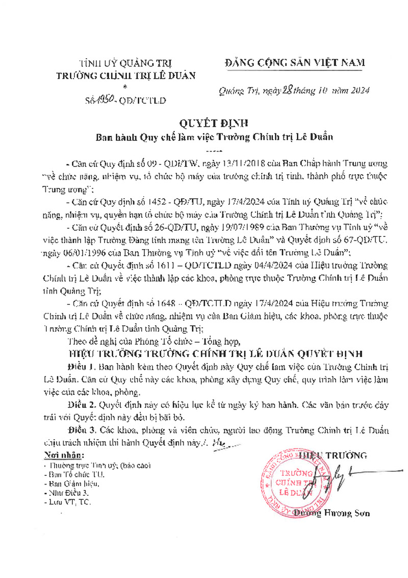 | Tiêu đề văn bản | Quyết định ban hành Quy chế làm việc Trường Chính trị Lê Duẩn | ||