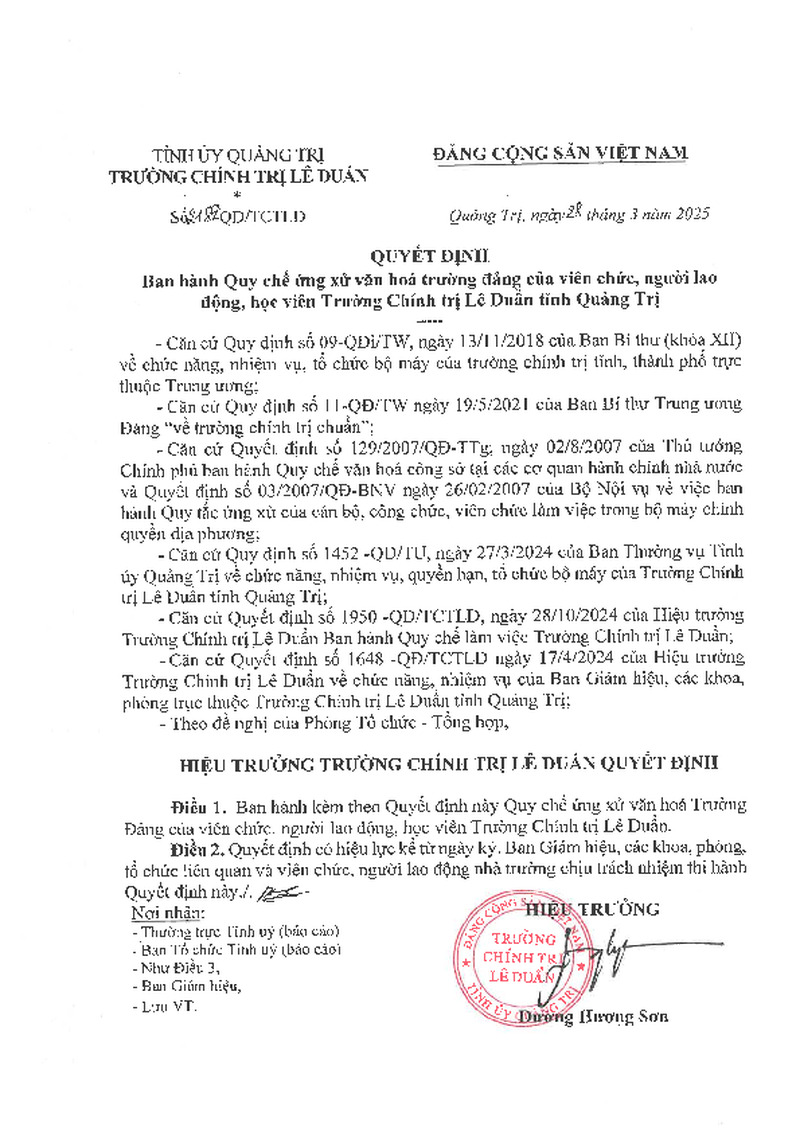 | Số hiệu | Quyết định ban hành Quy chế ứng xử văn hoá trường đảng của viên chức, người lao động, học viên Trường Chính trị lê Duẩn tỉnh Quảng Trị | Cơ quan ban hành | --- |