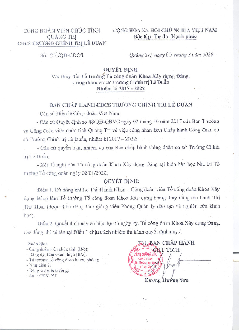 | Tiêu đề văn bản | Quyết định thay đổi Tổ trưởng Tổ công đoàn Khoa Xây dựng Đảng, Công đoàn cơ sở Trường Chính trị Lê Duẩn, nhiệm kỳ 2017-2022 | ||
