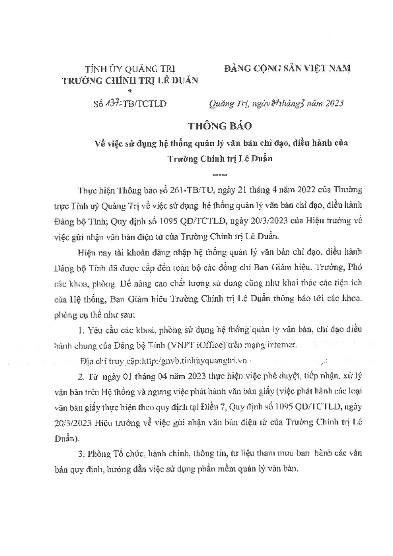 | Tiêu đề văn bản | Thông báo về việc sử dụng hệ thống quản lý văn bản chỉ đạo, điều hành của Trường Chính trị Lê Duẩn | ||
