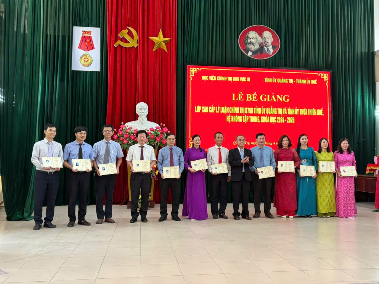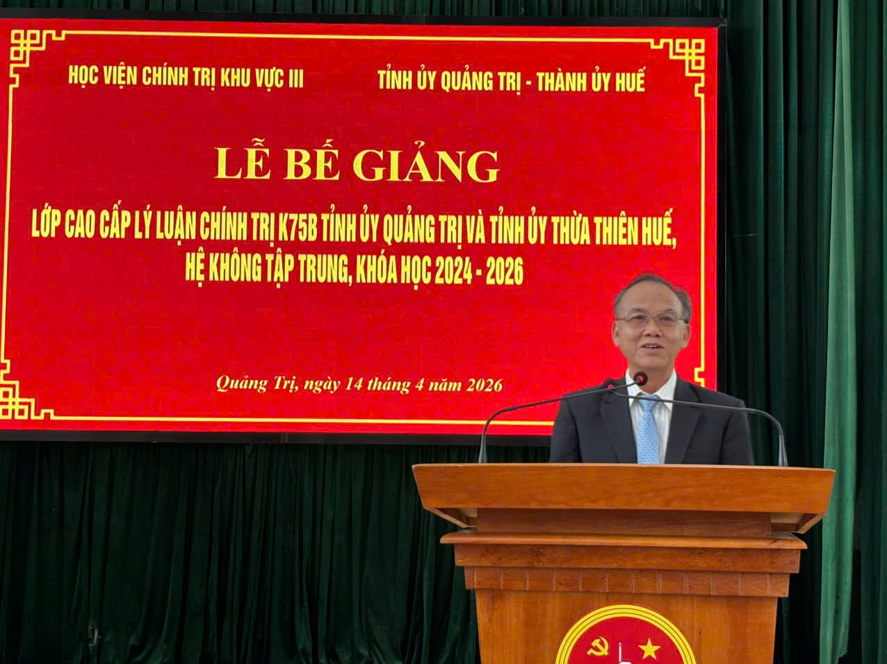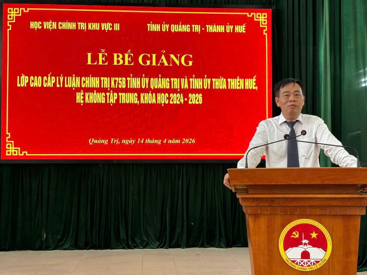 Chiều 14/4/2026, tại Trường Chính trị Lê Duẩn, Học viện Chính trị khu vực III phối hợp với Tỉnh ủy Quảng Trị và Thành ủy Huế tổ chức Lễ Bế giảng Lớp Cao cấp lý luận chính trị K75B Tỉnh ủy Quảng Trị và Tỉnh ủy Thừa Thiên Huế, hệ không tập trung, khóa học 2024-2026.