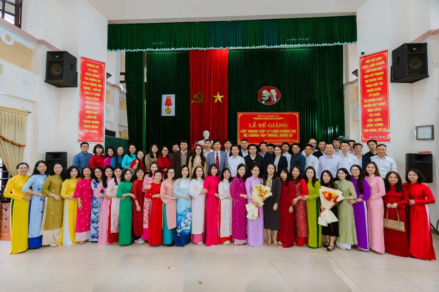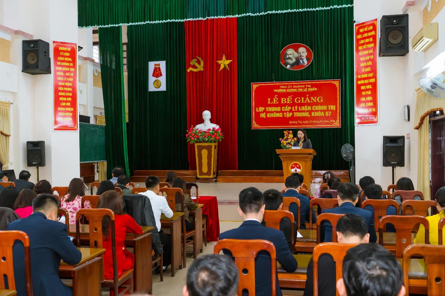 Chiều 23/01/2026, tại Cơ sở 2 (phường Nam Đông Hà), Trường Chính trị Lê Duẩn tỉnh Quảng Trị tổ chức Lễ Bế giảng Lớp Trung cấp Lý luận chính trị, hệ không tập trung, khóa 57. Đến dự có TS. Dương Hương Sơn, Phó Bí thư Đảng ủy, Phó Hiệu trưởng; TS. Thái Thị Hồng Minh, UVBTV Đảng ủy, Phó Hiệu trưởng; đại diện lãnh đạo các khoa, phòng; giáo viên chủ nhiệm và toàn thể học viên của lớp học.